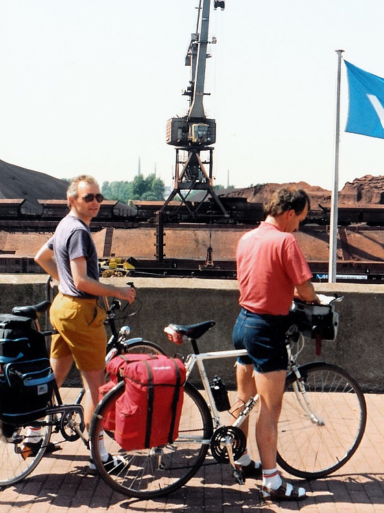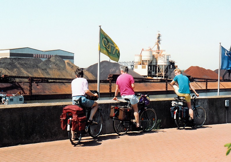Der Morgen bringt Entspannung in Essen im weitläufigen Park um die Villa Hügel. Über Wehrden, Kettwig, vorbei am Gelände der Landesgartenschau in Mülheim und unter der Selbstmörderbrücke von Mülheim durch kommen wir nach Duisburg. Wir durchqueren den riesigen Rheinhafen. Am Rhein entlang geht es weiter Richtung Norden. In Erinnerung bleibt die Pause in der Gaststätte Stapp am Deich unter Bäumen bei Dinslaken und 30 Grad Hitze. Die Apfelschorle zischt. Wir passieren das Kohlekraftwerk in Vörde und erleben vor Wesel eine interessante Rheinauen-Landschaft.
