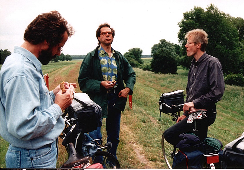 Die Bundesbahn bringt uns über Osnabrück nach Magdeburg, wo wir gegen 13:30 Uhr ankommen. Die Stadt wirkt auf uns großstädtisch laut und wenig einladend. Vom Bahnhof aus verlassen wir auf kürzestem Wege über drei hintereinander geschaltete Elbebrücken (Neue Strombrücke, Zollbrücke, Anna-Ebert-Brücke) die Stadt und gelangen so ans östliche Ufer der Alten Elbe. Auf Deichwegen kommen wir bis Plötzky, wo unsere erste Kaffeepause fällig ist. Über Pretzien fahren wir ostwärts über Dornburg mit einem großen gelben ein wenig heruntergekommenen und abgesperrten Barockschloss, Prödel und Güterglück nach Zerbst.