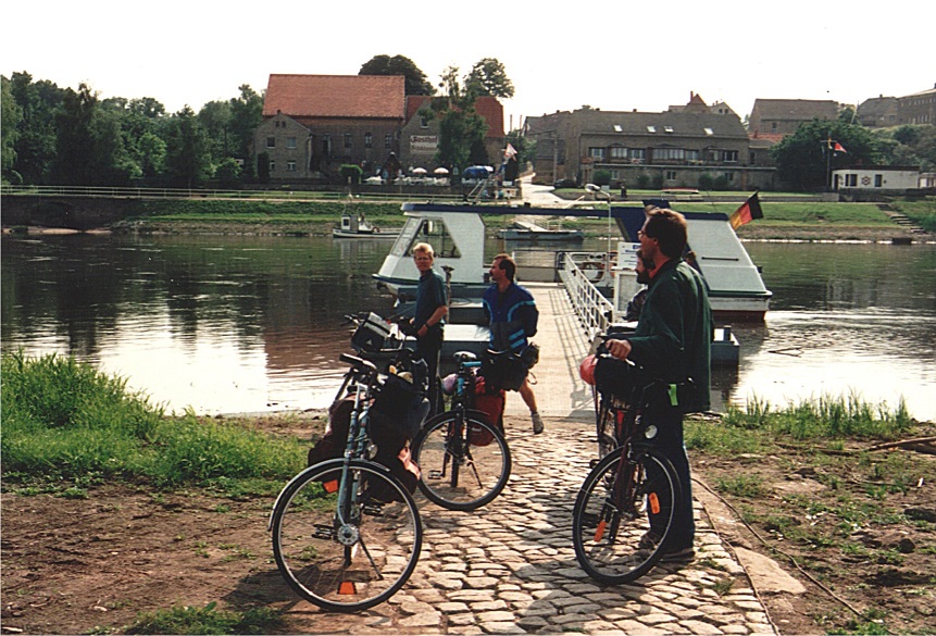 Überschlägige Berechnungen der Reststrecke nach Dresden veranlassen uns, eine Zwischenetappe mit dem Zug von Wittenberg nach Falkenberg (ab 8:49, an 9:30) einzulegen. Über Marxdorf, Saxdorf, Koßdorf, Brottewitz gelangen wir nach Mühlberg mit seinem Zisterzienser-Kloster „Güldenstern“ aus dem frühen 13. Jahrhundert zurück an die Elbe. Im Städtchen versorgen wir uns mit Nahrung. Das Elbufer ist hier kilometerlang mit Schnittlauch bewachsen. Die nächsten Orte sind Gaitzschhäuser, Kreinitz, Strehla, Zschepa, Bobersen. In Promnitz nehmen wir die Fähre nach Riesa. Dort haben wir uns eine Kaffeepause verdient.