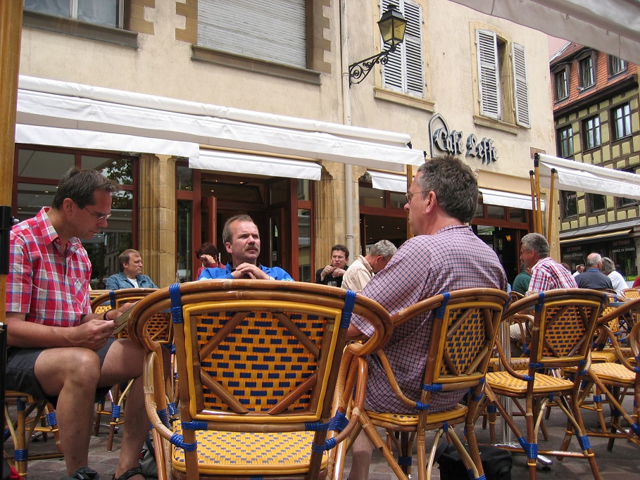 Colmar liegt im Herzen des Elsass und ist eines der Highlights der elsässischen Weinstraße. Ohne Übertreibung kann man feststellen: Colmar ist die „elsässischste“ aller Städte der Region. Selbst im an malerischen und pittoresken Orten so reichen Elsass nimmt Colmar einen besonderen Platz ein. Diejenigen von uns, die zum ersten Mal hier sind, machen einen ausgiebigen Stadtrundgang. Die „alten Hasen“ begnügen sich mit einem Straßencafe, dem Cafe Leffe an der Kathedrale von Colmar. Für die exklusive Lage zahlen wir kräftig mit.