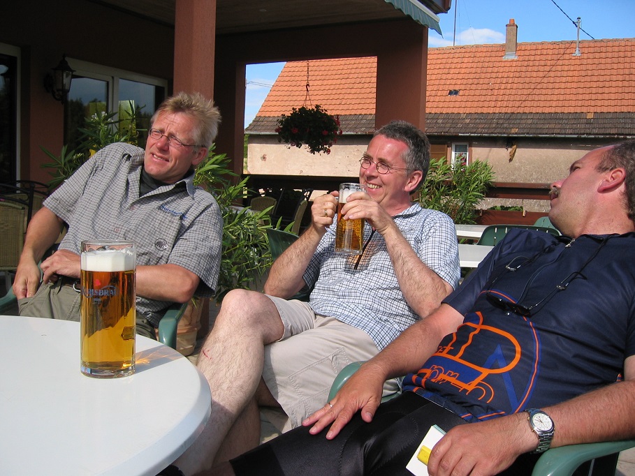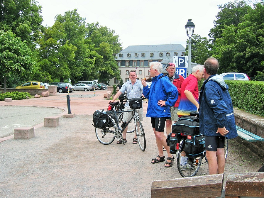 Hinter Rosheim werden die Weinberge seltener. Die Landschaft wandelt sich allmählich. Sie wird immer waldreicher. Als einzigen etwas größeren Ort durchfahren wir Wasselonne. Von dort ist es nicht mehr weit bis Birkenwald, einem winzigen Ort mit kaum zwanzig Häusern, aber mit zwei größeren Hotels. Der nördliche Teil der Vogesen hier nennt sich passender weise Waldvogesen. Wir finden im Hotel des Vosges Quartier. Es wird das Haus mit dem perfektesten Service dieser Tour. Eine unaufdringliche aber umsichtige Bedienung, ein ausgezeichnetes Abendessen begleiten einen sehr geselligen Abend, unterbrochen nur durch einen Spaziergang durchs Dorf, der naturgemäß nicht lange dauern kann. Zwanzig Häuser sind schnell abgeschritten. Die vielen Anstiege des Tages, Bier und Wein und die unverbrauchte Waldluft lassen uns bald in tiefen Schlaf fallen. Da das Hotel nahezu ausgebucht war, muss sich Karl-Heinz mit der winzigen Kammer des urlaubenden Azubis unter dem Dach begnügen. Das ändert aber nichts daran, dass dieses Hotel allen in bester Erinnerung bleiben wird.