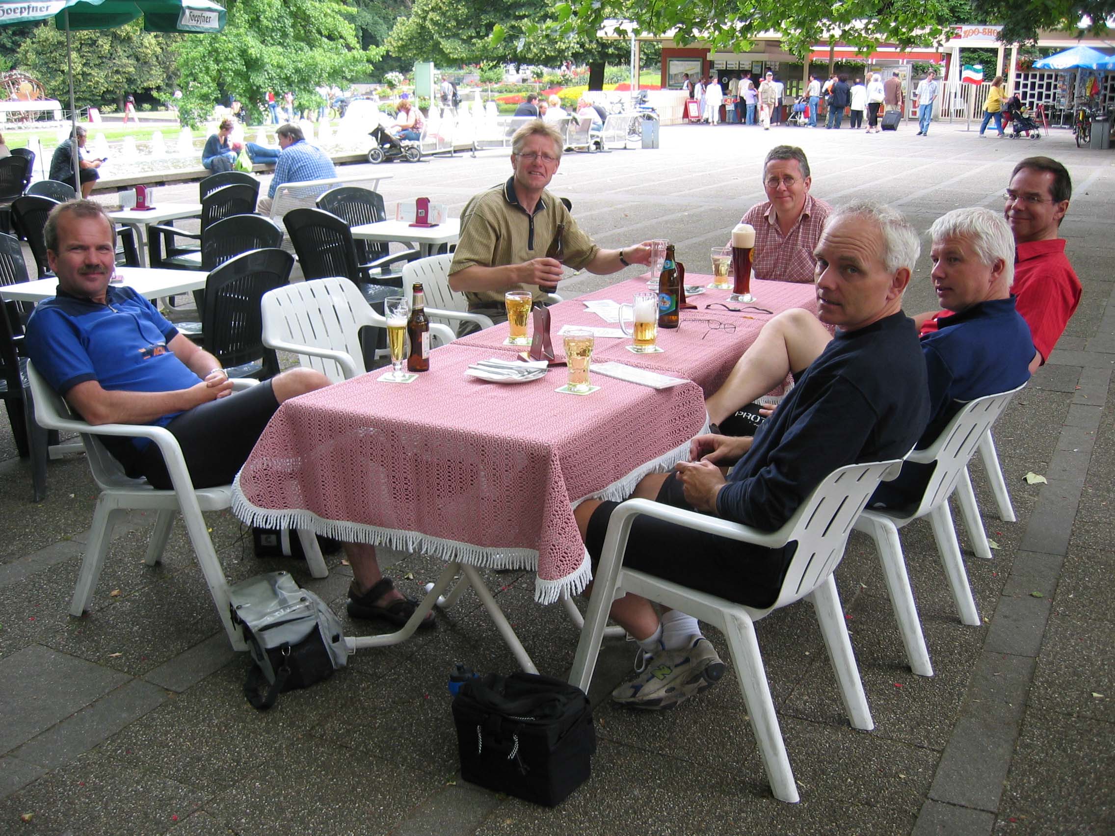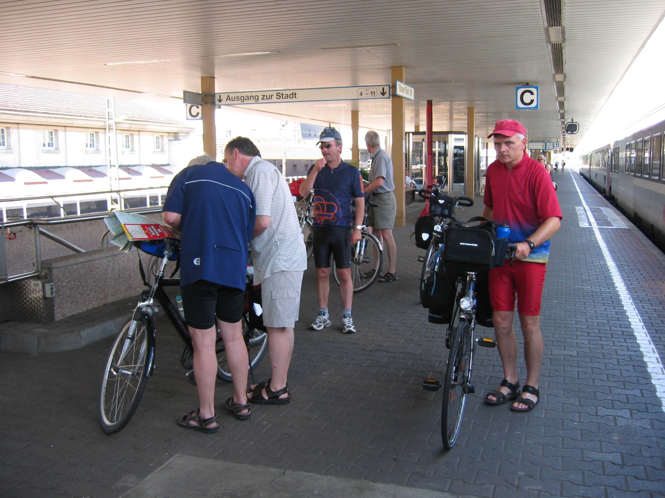 Der letzte Tag führt uns hinaus aus Wissembourg durch ein riesiges Waldgebiet, den Bienwald, bis nach Lauterbourg. Eine perfekt ausgebaute Teerstraße nahezu ohne Verkehr lässt uns diesen Abschnitt genießen. In Lauterbourg machen wir die letzte Rast in Frankreich. Auf Rheindeichen geht es noch ein Stück flussabwärts bis zur Rheinfähre bei Rheinstetten. Wir überqueren den Rhein und fahren weiter entlang des Flusses nach Karlsruhe. Mit einheimischer Hilfe gelingt uns die optimale Hineinfahrt in die Großstadt. Es geht immer am Reiherbach entlang inmitten eines Parks und Freizeitgeländes. Wir verlassen diese grüne Schneise erst unmittelbar vor dem Hauptbahnhof. Gegenüber am Eingang zum Zoo finden wir eine nette Gartenwirtschaft, in der wir die letzte Stunde vor der Rückfahrt nach Münster verbringen