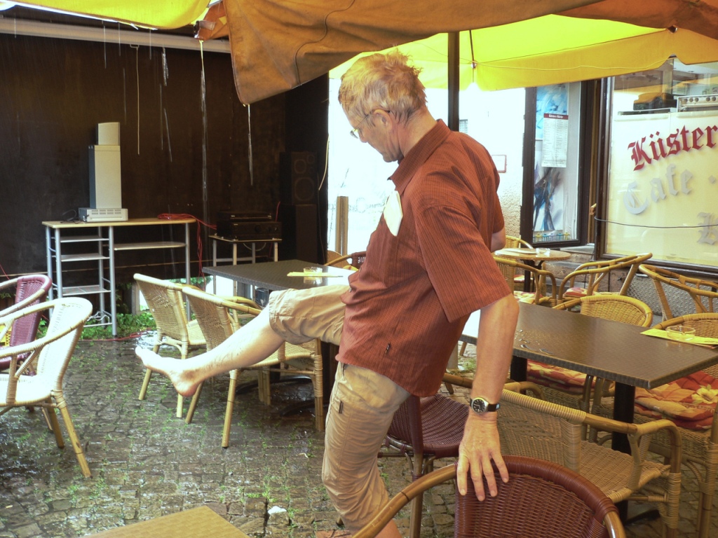 Weil es mit der Deutschen Bahn günstig nach Kassel geht, verlängern wir die Strecke noch um die Etappe entlang der Fulda bis Hannoversch Münden. Wir kommen mittags in Kassel an. Ein roter Teppich ist für uns ausgerollt und es regnet stark. Auf dem Weg durch die Innenstadt zur Fulda hat die Tour für Karl-Heinz schon fast ein Ende. Leicht abschüssiges nasses Basaltpflaster verträgt sich nicht mit einem Auto von rechts und plötzlichem Bremsen. Der Sturz geht heftig auf Knie und Ellenbogen. Das Knie wird acht Wochen brauchen, sich davon zu erholen.