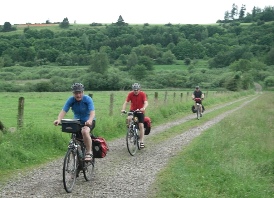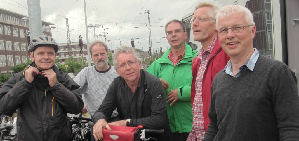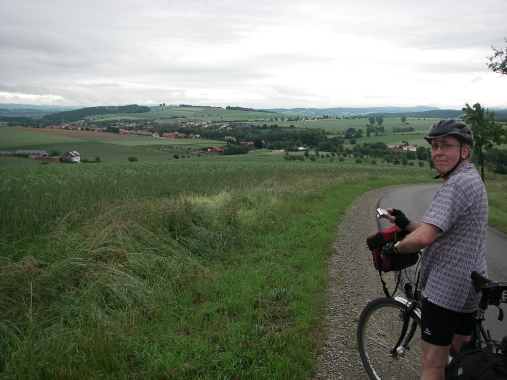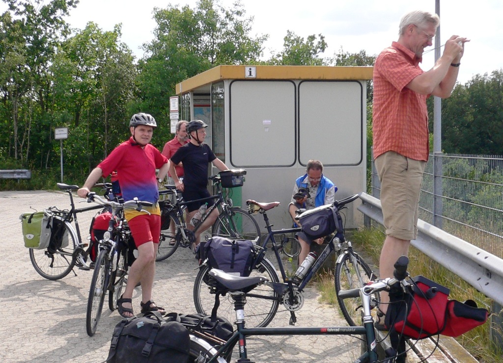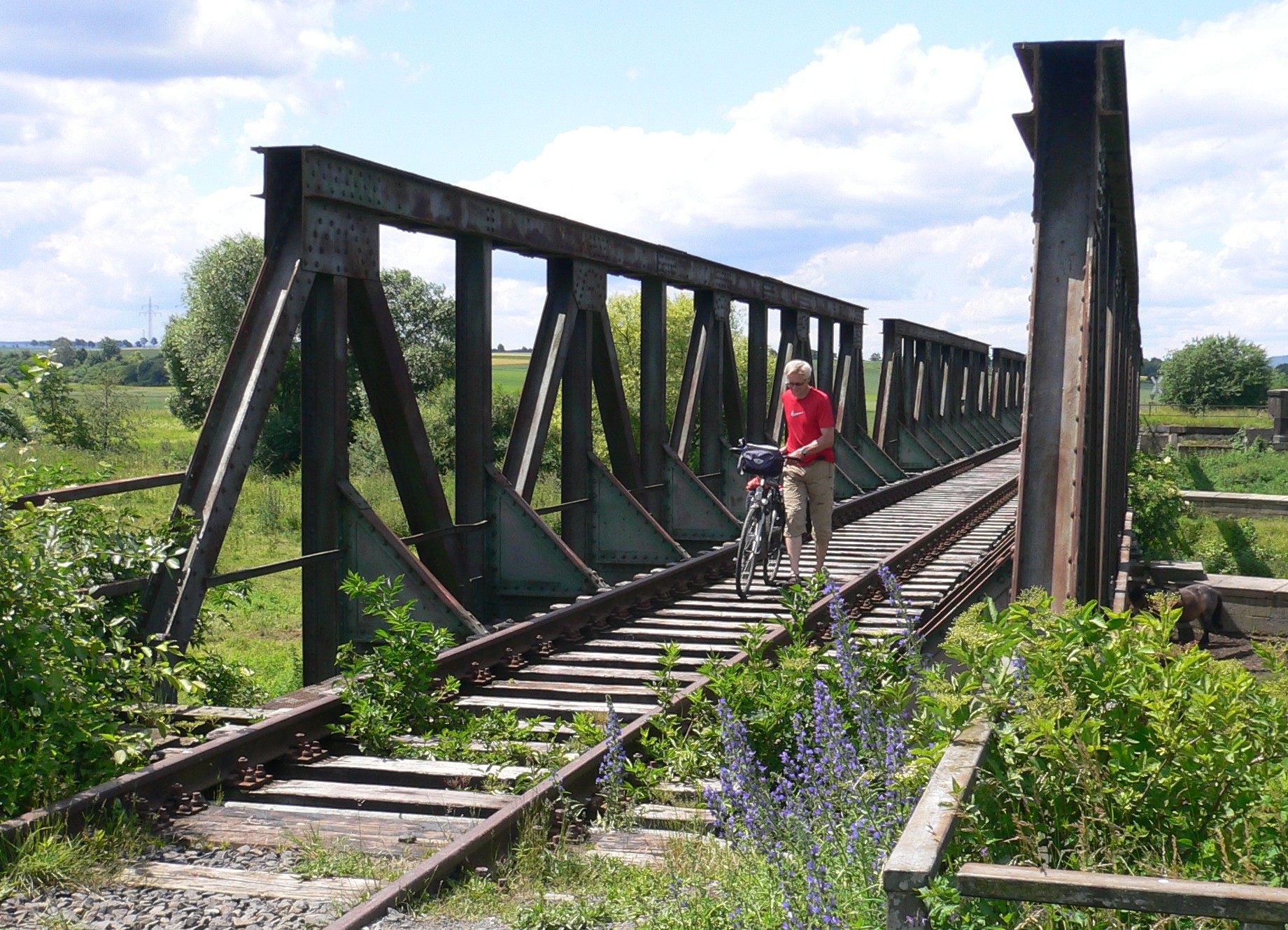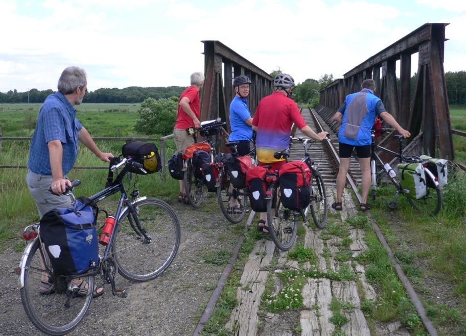 Ab Goslar fahren wir durchs Braunschweiger Land. Es ist stark landwirtschaftlich geprägt. Der hügelige Charakter verliert sich bis Braunschweig immer mehr. Die Ortschaften sind klein und unscheinbar: Jerstadt, Dörnten, Liebenburg, Gielde, Werlaburgdorf (Hier rasten wir vor der Dorfsparkasse), Börßum, Dorstadt, Ohrum. Lange noch sehen wir in der Rückschau allmählich den Harz mit dem alles überragenden Brocken verschwinden. Gleich hinter Werlaburgdorf wird es abenteuerlich. Wir müssen eine eigentlich gesperrte Eisenbahnbrücke über die Oker queren, ohne Sicherung von Schwelle zu Schwelle balancierend und dabei das Fahrrad halb tragend. Unter uns grasen Kühe. Karl kommt als letzter heil auf der anderen Seite an.