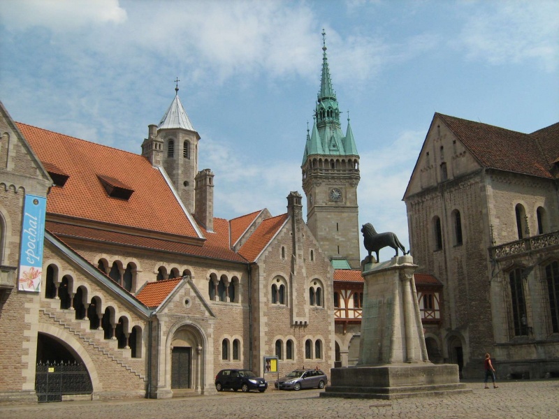 Durchs Okertal fahren wir weiter nach Braunschweig. Die Stadt zeigt sich uns mit imposanten Zeugnissen ihrer Geschichte. Hierhin waren die Welfenherzöge im 18. Jahrhundert von Wolfenbüttel umgezogen. Mit seinen 250.000 Einwohnern ist uns die Stadt aber zu groß und zu laut für uns Radreisende. Wir sind froh, Braunschweig wieder verlassen zu können. Karl-Heinz hat eine Erinnerung an Braunschweig aus der Jugendzeit. Und da kommt der Braunschweiger Löwe vor. Ihn finden wir aber nicht. Er wird zur Zeit von den Aufbauten eines Theaterevents verdeckt. Dieser Braunschweiger Löwe ist die älteste erhaltene Großplastik des Mittelalters nördlich der Alpen. Heinrich der Löwe ließ sie 1166 errichten. Bei der Outdoor-Version handelt es sich mittlerweile um einen Nachguss. Das Original steht geschützt in der Burg Dankwarderode nebenan.