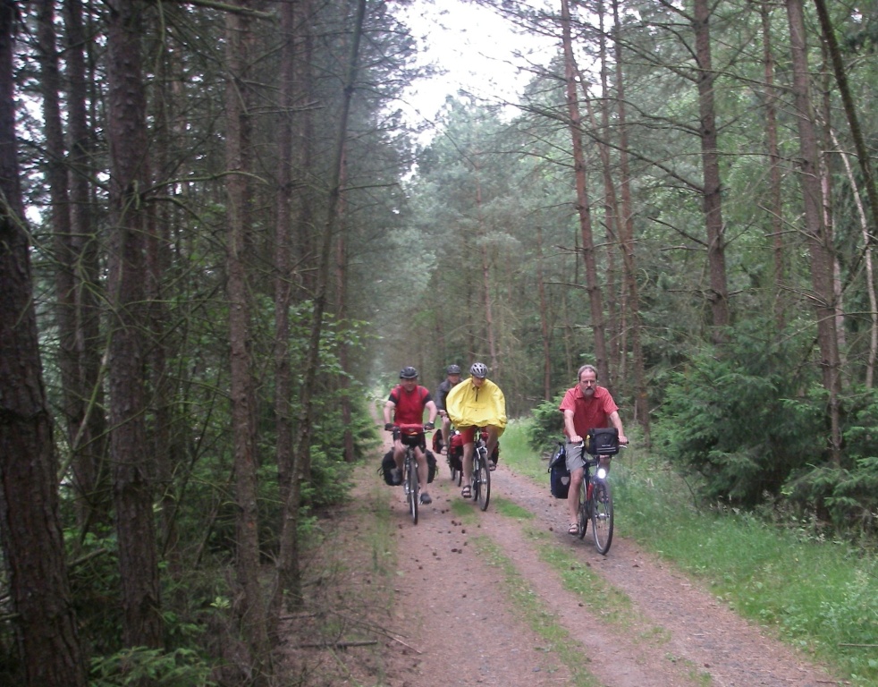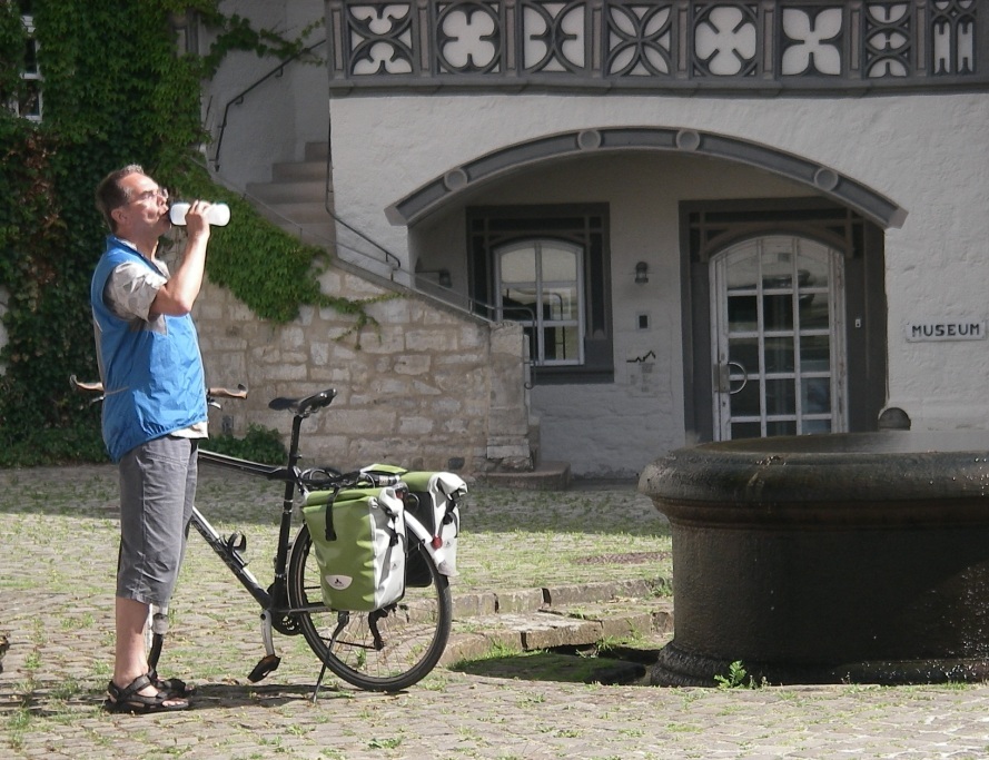 Bis Hannoversch Münden fahren wir durchs Fuldatal häufig auf unbefestigten Wegen. Zusammen mit dem Starkregen ergibt das eine lückenlose Dreckschicht auf Fahrern, Gepäck und Rädern. Unsere Pause in Hannoversch Münden nutzen einige, sich ein wenig zu säubern. Wir rasten im Küsterhaus in der Innenstadt.
