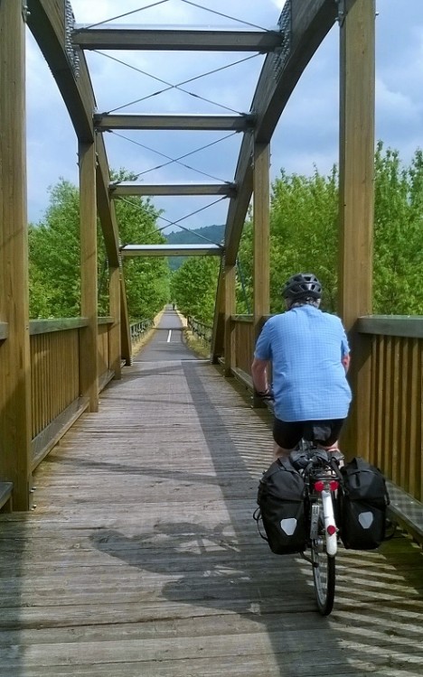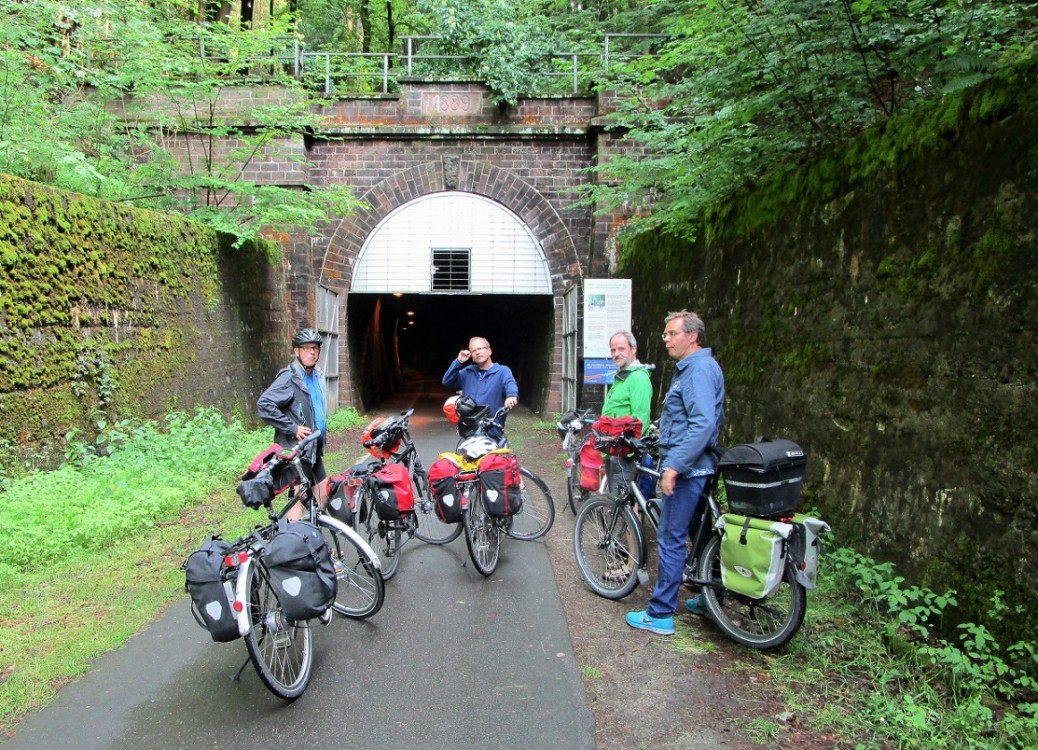 Kurz hinter Fulda soll uns eine alte Bahntrasse ohne große Mühen die Rhön hoch leiten. Noch bevor wir die Trasse erreichen, fahren wir irrtümlich rechts und quälen uns dadurch völlig ohne Notwendigkeit nach Petersberg hoch. Immerhin gibt es dort oben die Grabeskirche der Hl. Lioba. Es ist von da ein mühseliger und verkehrsreicher Weg, bis wir endlich bei Niederbieber auf die Bahntrasse stoßen. Darauf geht es dann stetig bergauf für die nächsten 15 Kilometer bis zum Milseburg-Tunnel. Der Tunnel ist 1.173 Meter lang und von Mitte April bis Ende Oktober für den Fahrradverkehr geöffnet (mit Beleuchtung). In der übrigen Zeit ist er Ruheort für Fledermäuse. Durch den Tunnel haben wir uns reichlich 100 Höhenmeter erspart. Am Tunnelausgang machen wir Pause im Cafe des dortigen Honigkuchen- und Wachsmuseums. Beinahe müssen wir uns entschuldigen, dass wir die mürrische Bedienung um seine Ruhe bringen.