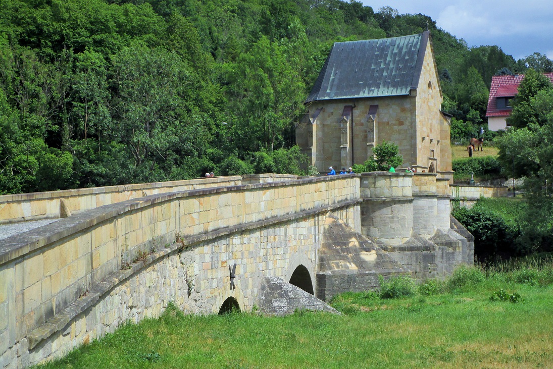 Hinter Gerstungen grüßt hoch über Lauchröden die Burgruine Brandenburg aus dem 12. Jahrhundert. Bei Hörschel unterfahren wir die Autobahnbrücke der A4 über die Werra. Eisenach und die Wartburg sind ganz nah. In Hörschel beginnt auch ganz offiziell der Rennsteig über den Thüringer Wald. Die letzten Kilometer entlang der Werra führen uns noch bis Creuzburg. Kurz vorher machen wir noch einmal Rast im Stiftsgut Wilhelmsglücksbrunn, seit der ersten Erwähnung 1426 bis Mitte des 19. Jahrhunderts Saline, danach Kurbad und nach der Wende Bioland-Hof. Hier hat sogar einmal unser großer Dichterfürst Goethe logiert. Vor Creuzburg imponiert eine alte Steinbrücke aus dem 13. Jahrhundert mit zugehöriger Brückenkapelle. Oberhalb der Stadt liegt die Burg Creuzburg, die auch als Schwesterburg der Wartburg bekannt ist.