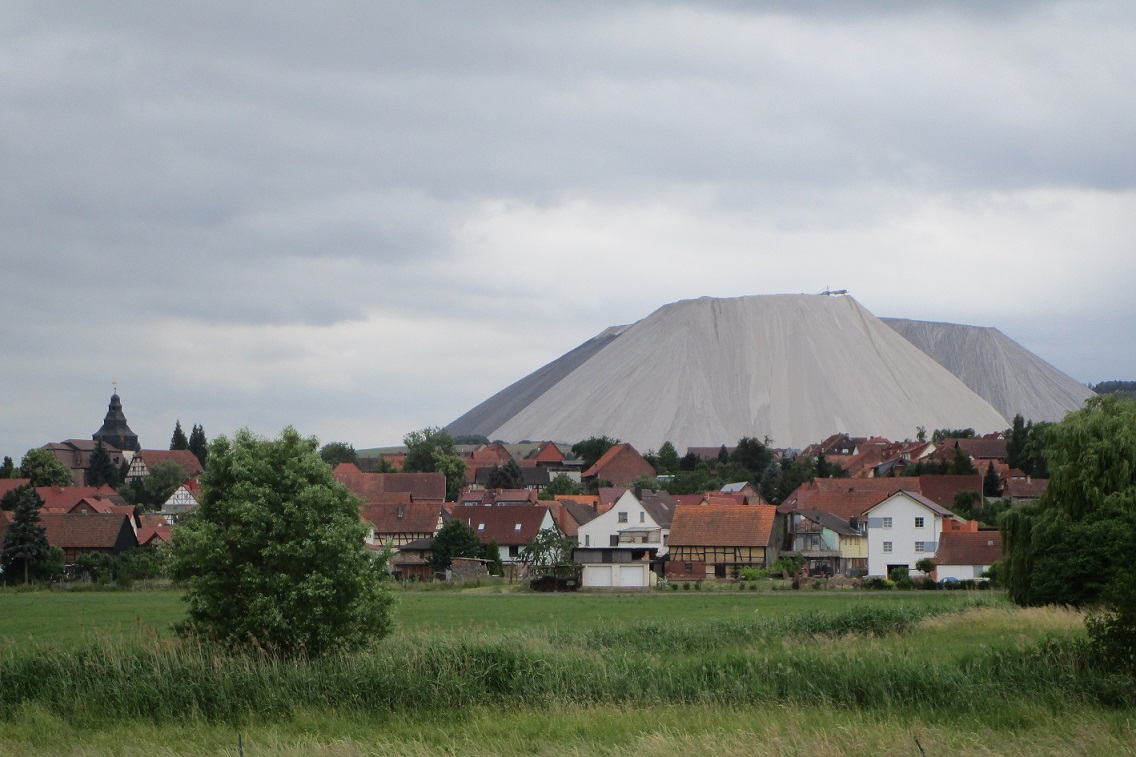 Bei Philippsthal erreichen wir die Werra. Hier ist die Kali-Abraumhalde Hattorf für längere Zeit unser landschaftsprägender Begleiter, bevor uns bei Heringen die dritte und letzte Abraumhalde unserer Tour, der Kalimandscharo, beeindruckt. Das zugehörige Bergwerk ist heute das größte Kaliabbaugebiet der Welt und hat etwa die Abbaufläche des Großraumes Münchens. Was verwundert ist die Tatsache, dass die beiden Halden, denen wir begegnen, auf hessischem Gebiet liegen. Dabei war es doch angeblich nur die DDR, die die Werra mit ihren Kalibergwerken versalzen hat.