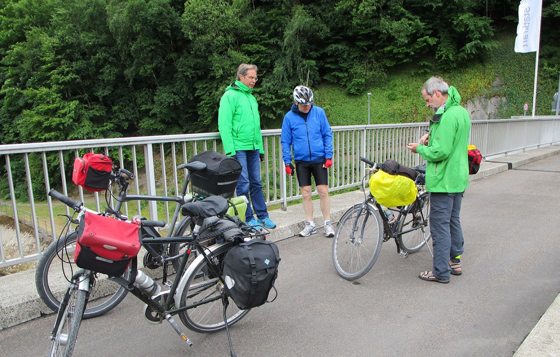 Über Kaufungen, Heiligenrode geht es weiter nach Sandershausen, wo wir die Fulda erreichen. Immer wieder haben wir einen Blick auf Kassel, das wir aber weiträumig umfahren. Für einige Kilometer bleiben wir an der Fulda, bis wir bei Wahnhausen über die Fulda-Staustufe die Flussseite wechseln. Für Jürgen heißt das gleichzeitig Kettenwechsel und der geht so: Den kurzen aber steilen Anstieg auf die Staustufe will er in seiner unnachahmlichen Manier durch schiere Kraft bewältigen. Er übertreibt und die Kette reißt. Was macht man dann an einem Samstagnachmittag fernab jeder größeren Ansiedlung? Karl fragt einfach den nächstbesten Radler, der sich ebenfalls die Fulda von oben anschaut. Und der hat tatsächlich eine Ersatzkette dabei. Und es ist auch noch eine passende. Und er verkauft sie Jürgen bereitwillig. Und mit Christian haben wir einen erfahrenen Kettenwechsler dabei. Es dauert keine Stunde, bis wir weiterfahren können. So ein Pannenglück sollte man kein zweites Mal erwarten.