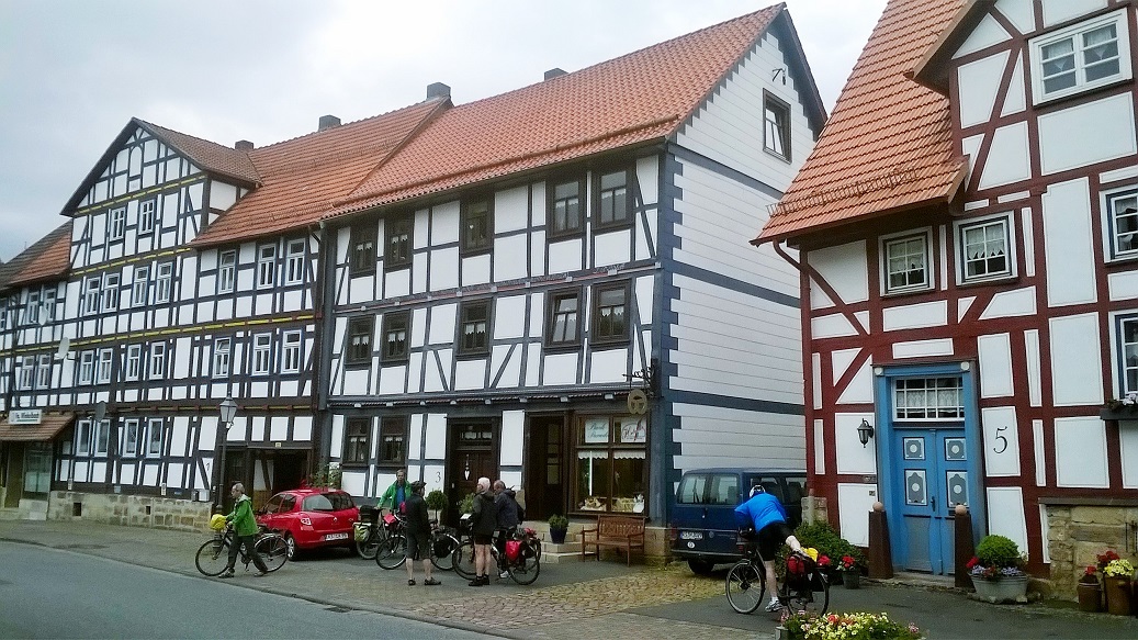Von der Fulda nehmen wir noch eine große Schleife mit bis wir sie bei Knickhagen verlassen. Wir fahren jetzt durch weites offenes Hügelland, vor uns den Habichtswald und hinter uns im Osten den Reinhardswald. In Immenhausen starten wir den ersten Versuch des Tages, ein Quartier zu finden. Der Ort macht zwar einen netten Eindruck, außer einer Pension hinter dem Rathaus, die nicht einmal genügend Betten für uns hat, werden wir aber nicht fündig. Immerhin reicht es für eine Pause im Eiscafé an der Stadtmauer. Den nächsten Anlauf nehmen wir in Grebenstein. Dort gibt es zwar ein gediegenes Hotel die Deutsche Eiche, es gelingt aber nicht, irgendjemanden vom Personal zu finden. Es uns bald zu bunt und wir beschließen, noch bis Hofgeismar weiter zu fahren.