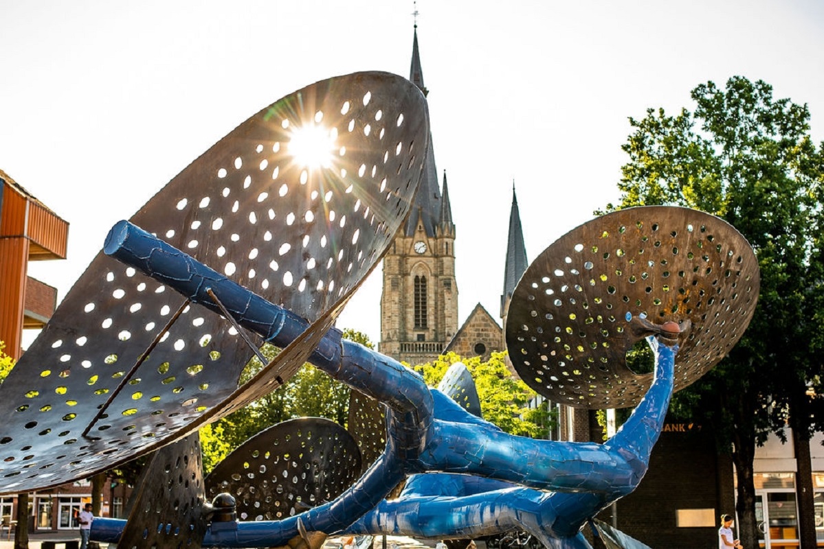 Wir treffen uns um 9 Uhr vor dem Hauptbahnhof. Die erste Tour ist von Peter geplant. Der Weg führt uns über die Promenade, durch das Kreuzviertel und den Nordpark bis zum Heidekrug und weiter vorbei an Greven und Reckenfeld bis zur Traditionsgaststätte Lintels Kotten vor Emsdetten. Hier erwartet uns Karl, der sich den morgendlichen Weg nach Münster geschenkt hat. Entlang des Mühlenbachs führt Karl uns bis ins Zentrum von Emsdetten. Am Ortseingang verschaltet Peter sich an einem kleinen Anstieg und sorgt für einen kleinen Auffahrunfall mit Jürgen und Christian als Hauptbetroffenen. Auf dem Marktplatz beim Cafe Extrablatt ist Mittagspause. Das Cafe eröffnete dort 1988 als erstes von mittlerweile bundesweit mehr als 90 Extrablättern. Dominiert wird der Marktplatz vom Morgentaubrunnen einer überdimensionierten Blütenskulptur des Emsdettener Künstlers Walter Jasper. Ob er den Marktplatz bereichert, darf bezweifelt werden.