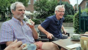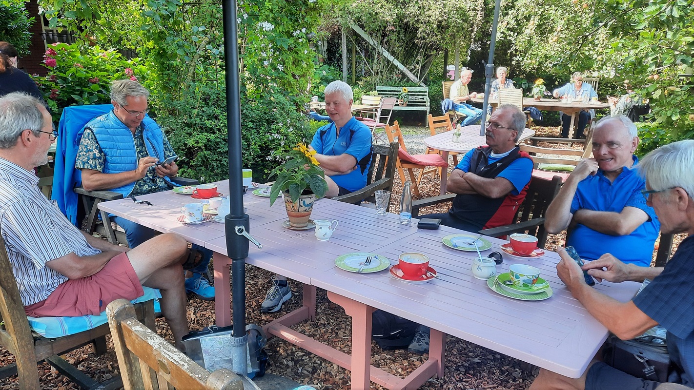 Da unser heutiges Ziel, das Café Blumenkränzchen in Nottuln, erst um 14 Uhr öffnet, treffen wir uns heute erst um 10 Uhr vor dem Hauptbahnhof. Jürgen übernimmt es, uns aus der Stadt herauszuführen. Auf bisher nie gefahrenen Wegen geht es durch das Geistviertel, Berg Fidel und Vennheide nach Hiltrup. Auch Hiltrup durchqueren wir sehr grün und verkehrsfern. Wir erreichen den DEK in Höhe der Kanalinsel, queren ihn über die Amelsbürener Straße und kommen entlang des Emmerbach nach Amelsbüren. Auch hier noch kennt Jürgen geheime Pfade entlang des Dorfrandes. Die werden Günter fast zum Verhängnis. Er stürzt ins Grün, weil seine Vorfahrer plötzlich bremsen. Mann und Rad bleiben heile. Weiter geht es durch die Venne nach Senden. Hier eine geeignete Lokalität für eine Pause zu finden, bedarf einiger Abstimmungsrunden. Schließlich landen wir in der Eiszeit, einem italienischen Eiscafé, am Marktplatz. Vor der Weiterfahrt treffen wir noch unseren alten Chef nebst Gattin auf ein Pläuschchen.