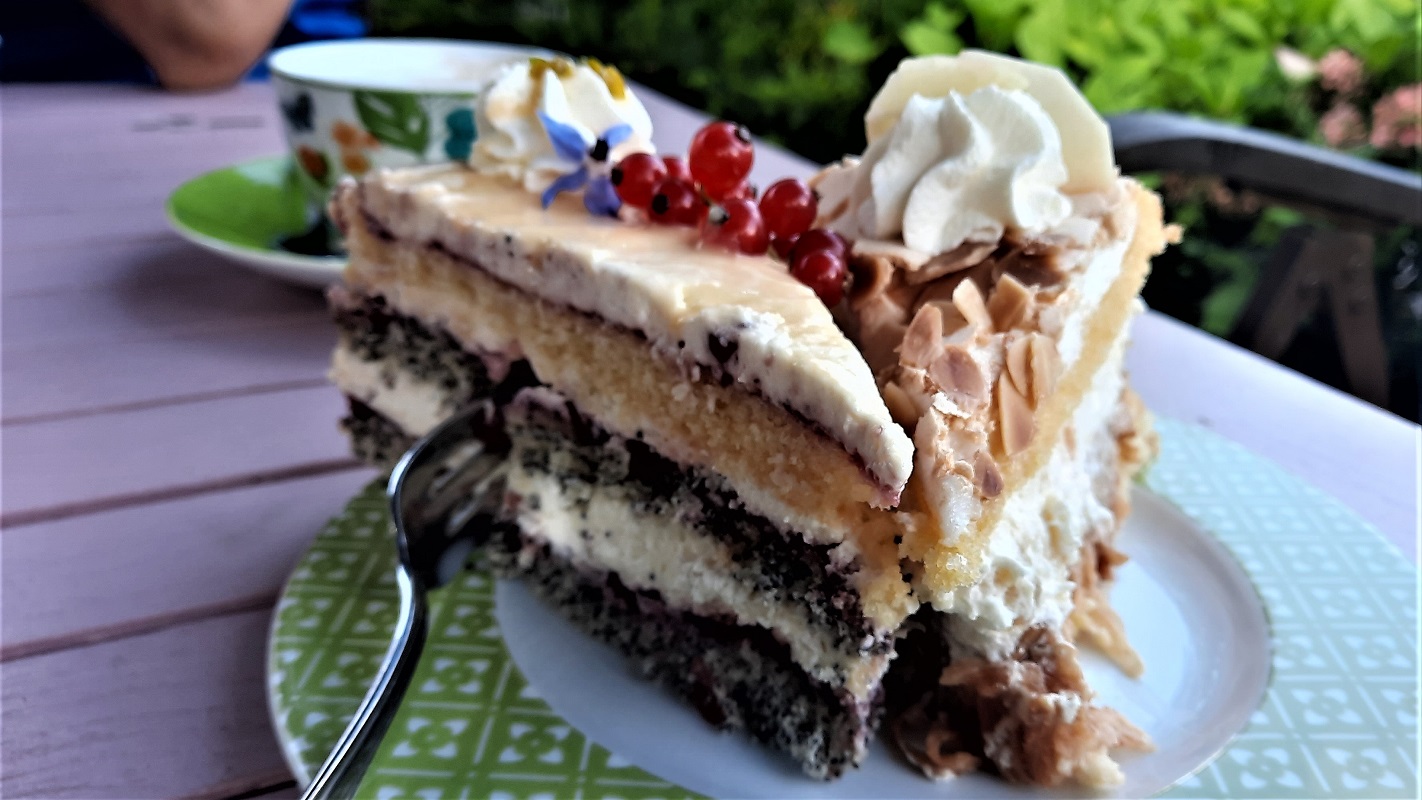Das Gasthaus „Zum letzten Tee“ gehört zum Golfclub, der unmittelbar neben dem Schloss gelegen ist. Hier finden wir gerade noch einen Tisch für eine weitere Pause.