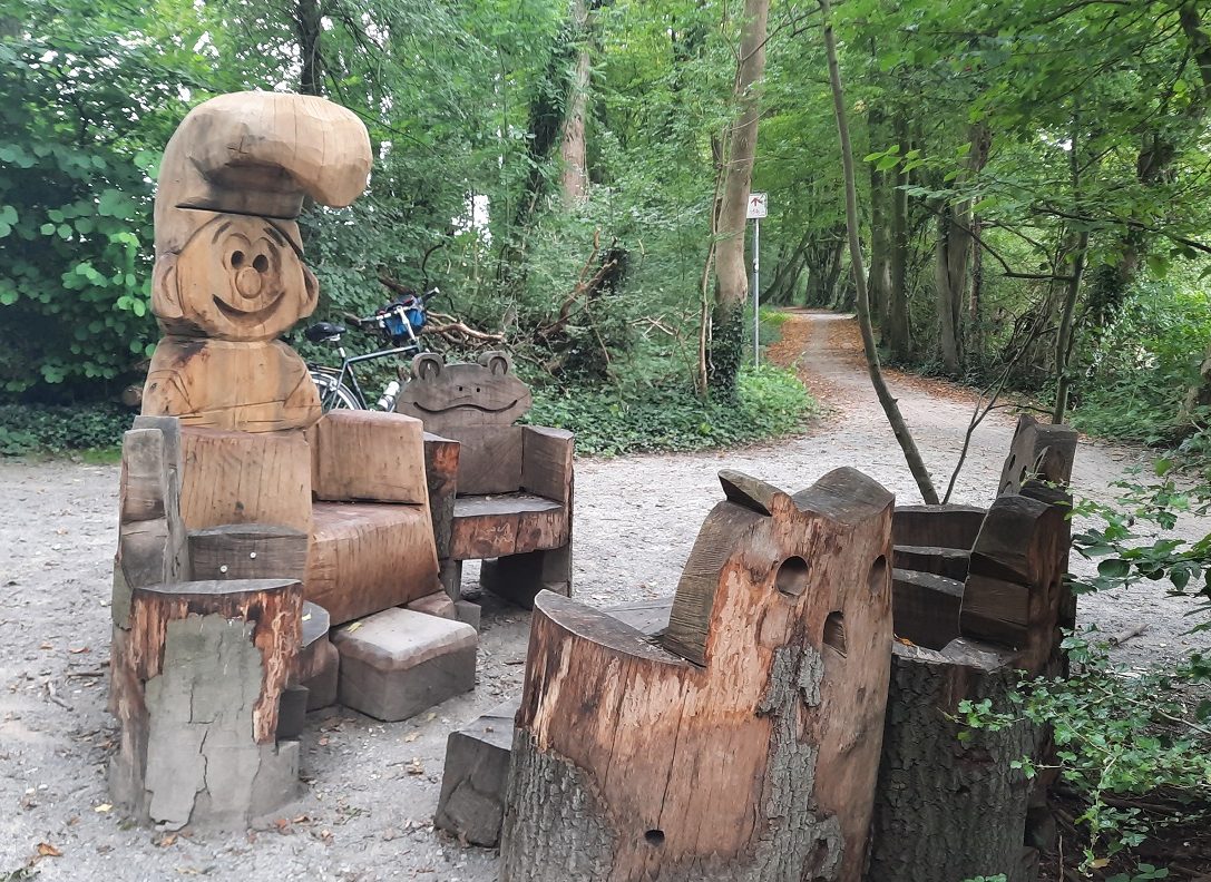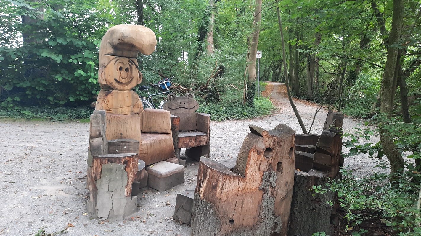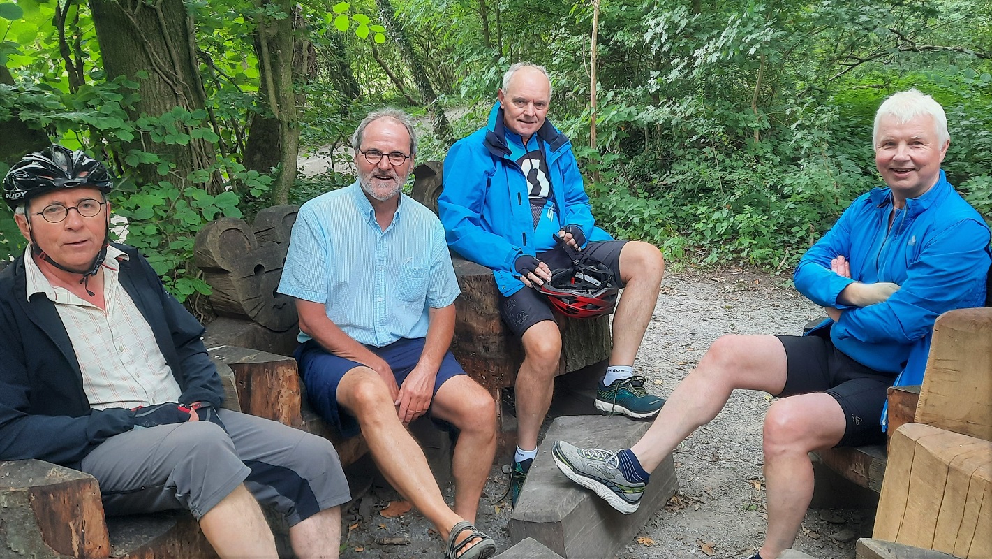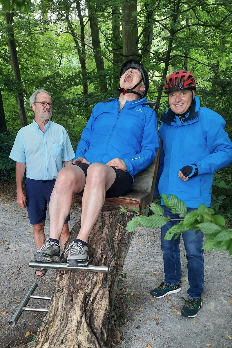 Heute am Samstag bröckelt die Teilnahmebereitschaft. Christian, Karl und Peter melden sich wegen dringender privater Termine ab. Eine Tagesetappe zu viert hat es noch nie gegeben. Trotz der kleinen Besetzung: Die Stimmung ist gut und das Wetter perfekt. Die Gasselstiege führt uns heraus aus der Stadt. Jürgen zeigt uns hier die Hinterlassenschaften eines Kettensägenfans. Keine große Kunst aber doch eindrucksvoll.
