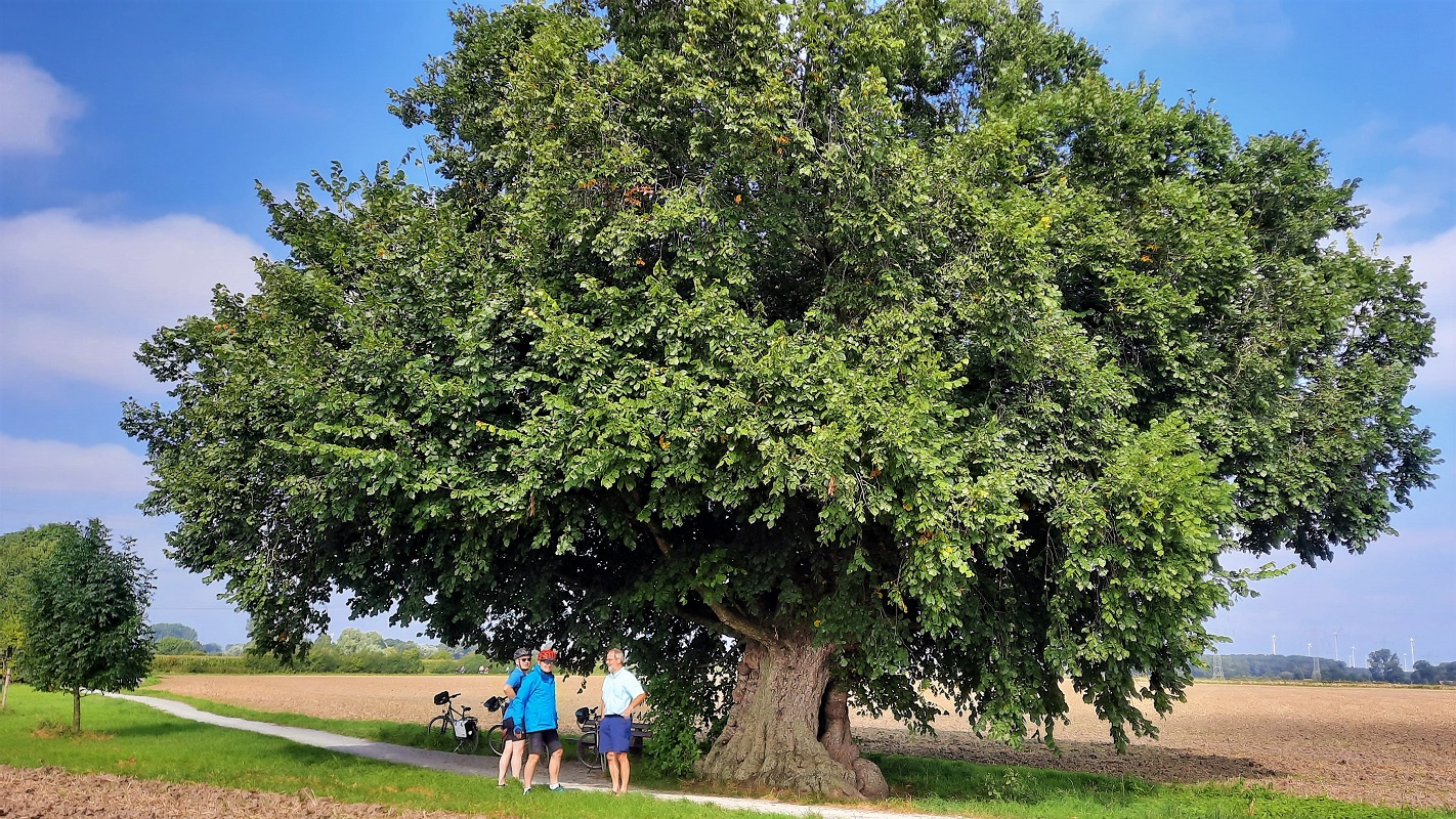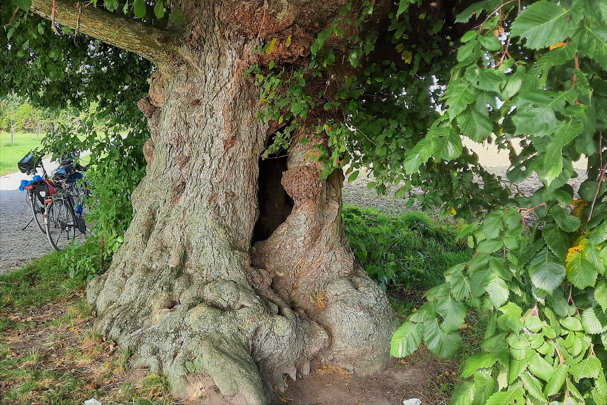 Über Häger geht es weiter nach Altenberge mit einer kurzen Rast am Kirchplatz. Nächstes Ziel ist Holthausen. Auf dem Weg dahin kurz vor der Überquerung der Steinfurter Aa halten wir an einer sehr alten knorrigen Ulme. Das imposante Naturdenkmal ist innen völlig augehöhlt, zeigt aber mit seinem dichten grünen Dach noch immer einen starken Lebenswillen.