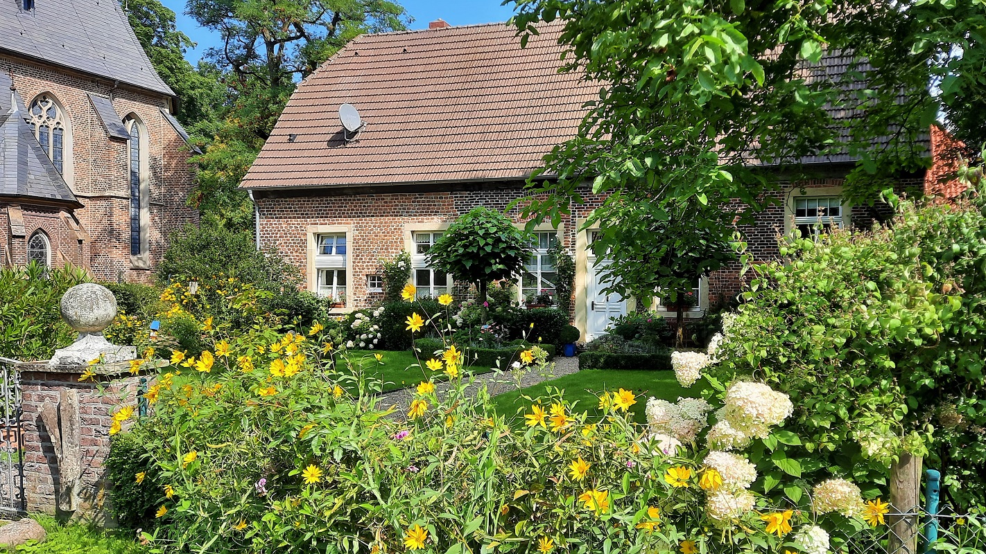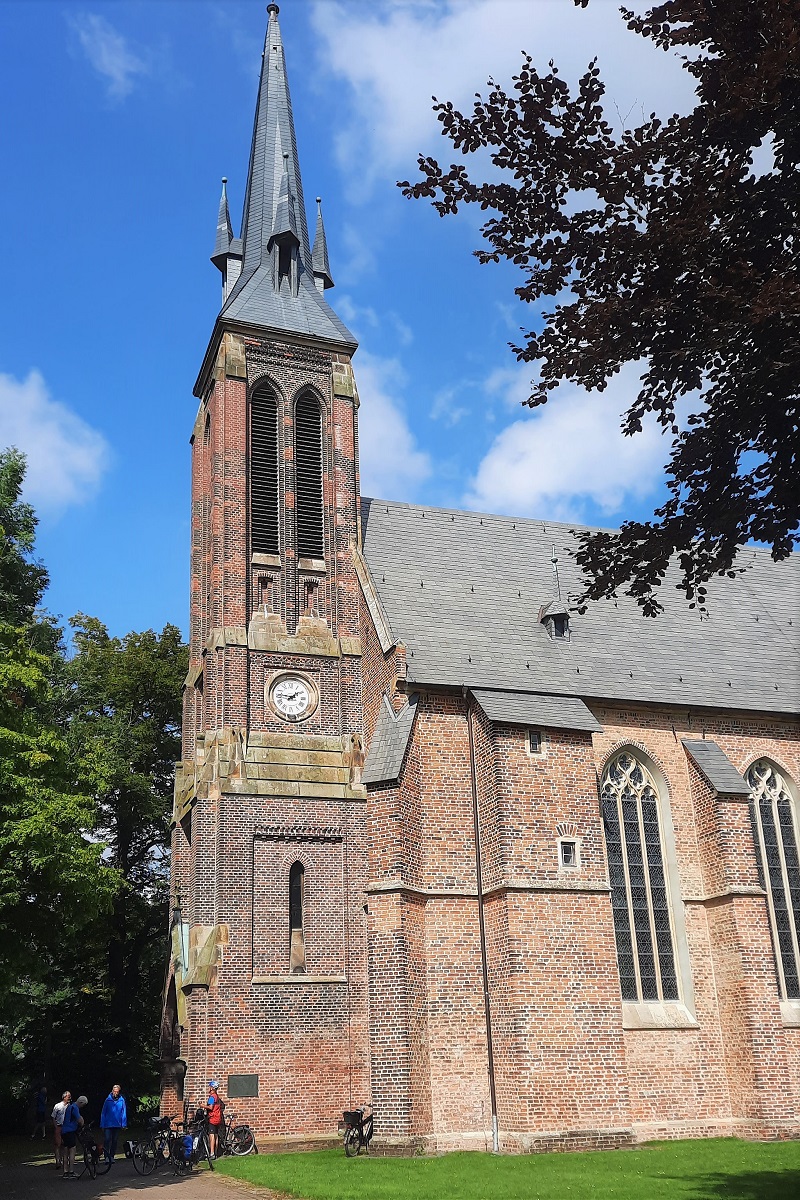 Wir finden den gut ausgebauten Radweg entlang der Stever. Er begleitet uns bis Appelhülsen. Weil es noch recht früh ist, entschließen wir uns zu einem Umweg über Buldern nach Karthaus mit Kirchenbesichtigung. Der Flecken geht zurück auf eine Gründung der Kartäuser, der Kartause Marienburg, im 15. Jahrhundert zurück. Bei der Kirche St. Jakobus handelt es sich um die ehemalige Klosterkirche. Bekannt ist der Ort durch das Anna-Katharinen-Stift, einer katholischen Reha-Einrichtung für Erwachsene mit körperlichen oder geistigen Beeinträchtigungen. Die dortigen Werkstätten bieten mehr als 500 Menschen mit Behinderung eine geregelte Arbeit. Auf kürzestem Wege geht es von hier nach Nottuln. Im Café Blumenkränzchen finden wir ein lauschiges Plätzchen und wir genießen die wirklich außergewöhnlich leckeren Kuchen und die ganz besondere Atmosphäre dieser Gartenanlage.