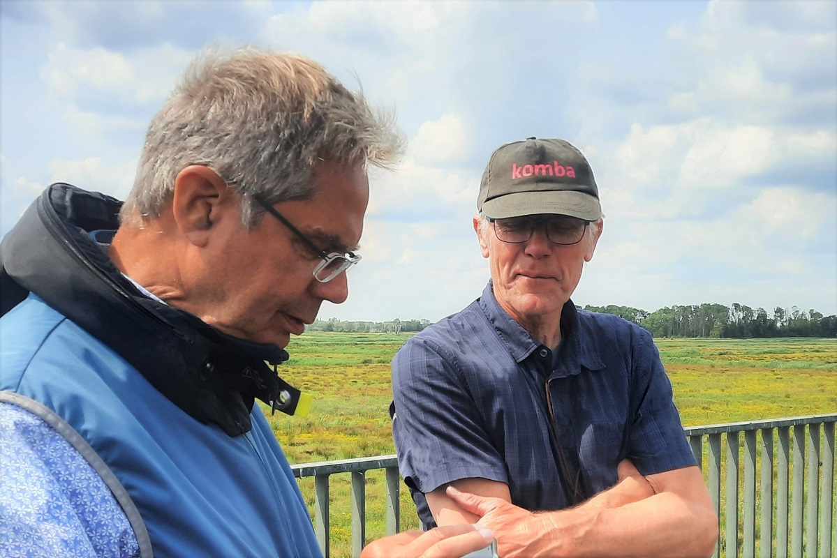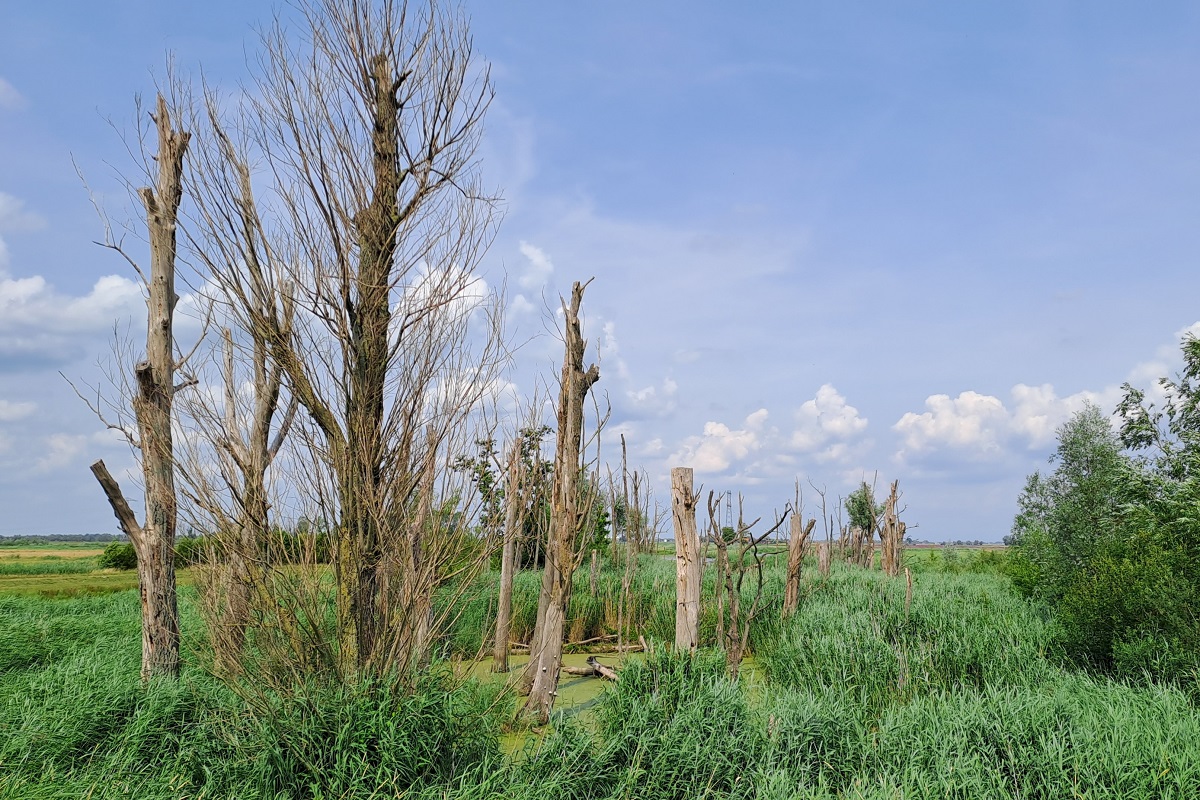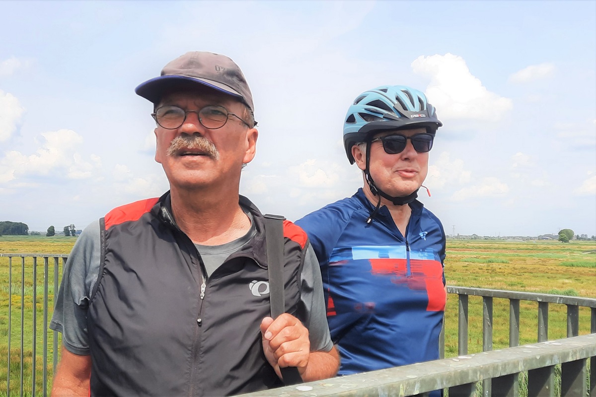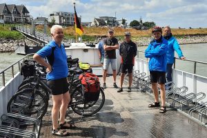 Als endlich alles ausgetrunken und gegessen ist, wollen wir unsere Fähre nehmen, erleben aber unseren ersten Reinfall. Die Fähre hat wegen Personalmangel außerplanmäßig seinen Dienst für den heutigen Tag eingestellt. Fehlendes Personal scheint also nicht nur bei uns in Deutschland ein Problem zu sein. Zunächst sind wir ratlos, kommen aber sehr bald zur Erkenntnis, dass wir umkehren und die nächste Fähre weiter östlich über die Nieuwe Merwelde finden müssen. Mittlerweile sind zwei ältere holländische E-Bikerinnen auf uns aufmerksam geworden. Sie unterstützen uns wortreich bei unserer Wegeplanung und erklären sich schließlich dazu bereit, uns auf dem Weg zur Ersatzfähre zu begleiten. Die nächsten 17 Kilometer hecheln wir hinter den beiden flotten Damen her. Bei Boven Hardinxveld erreichen wir die Fähre, müssen allerdings eine halbe Stunde warten um nach Werkendam auf der anderen Seite zu kommen. Unsere beiden Führerinnen nehmen die Fähre ebenfalls. Sie erklären sich sogar bereit, uns bis in den Biesbosch zu bringen. Es wird eine anstrengende Fahrt mit heftigem Gegenwind. Nachdem wir uns bei den netten Ladies bedankt haben, sind wir wieder Herren der Geschwindigkeit. Wir fahren eine gemütliche große Runde durch einen Teil des Biesbosches.