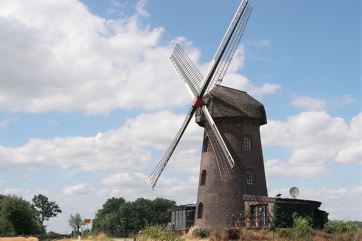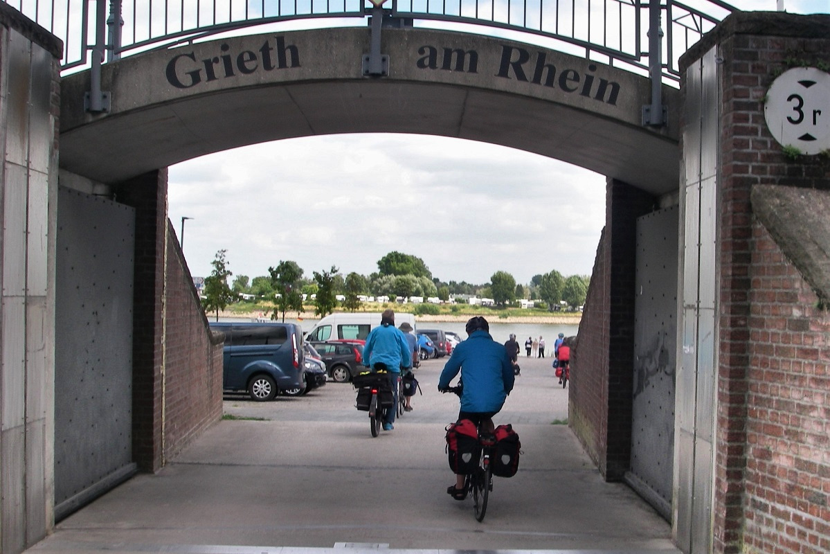 Noch fünfzehn Kilometer und wir erreichen den ehemaligen Fischerort Grieth nahe bei Kalkar den Rhein. Obwohl der Ort weniger als 1000 Einwohner hat er wegen der Einheit von Kirche, Marktplatz und dichtbebauten Straßen und Gassen einen kleinstädtischen Charakter. Hier pendelt in den Sommermonaten eine autofreie Fähre über den Rhein.