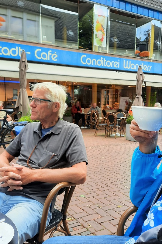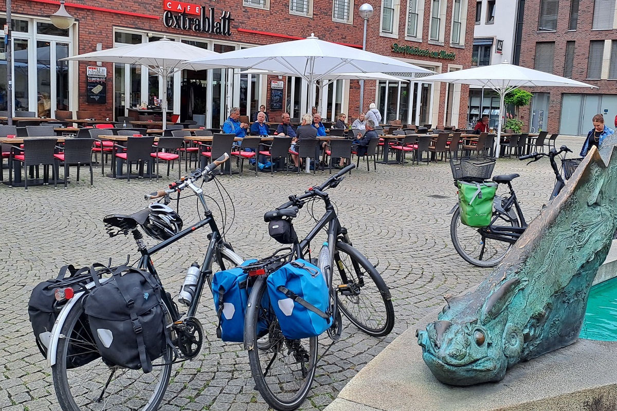 Wir haben die Route so geschickt gewählt, dass wir am Klever Sendemasten auf dem Klever Berg landen, der mit 108 Metern der höchste Punkt des gesamten Niederrheinischen Höhenzuges ist. Nach Christians Tacho haben wir heute insgesamt 230 Höhenmeter gemacht. Von hier oben geht es hinab in die Innenstadt, wo wir beim Stadtcafé Wanders eine ausgiebige Mittagspause machen.