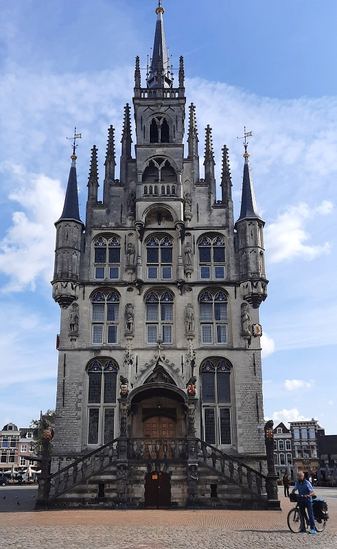 Bei Sonnenschein starten wir am Morgen zunächst auf einen Abstecher nach Gouda einige Kilometer westlich. Entlang der Hollandse Ijssel sind wir nach wenigen Kilometern in der Stadt. Gouda liegt am Zusammenfluss von Gouwe und Hollandse Ijssel und hat ein gut erhaltenes historisches Stadtzentrum mit vielen denkmalgeschützten Gebäuden. Der Marktplatz, bekannt ist einer der schönsten Plätze in den Niederlanden und wird von einer Reihe prächtiger Gebäude umgeben, darunter das gotische Rathaus aus dem 15. Jahrhundert. Berühmt ist auch die Waage aus dem 17. Jahrhundert an der Nordseite des Marktes. Natürlich verbindet man mit dem Namen Gouda den gleichnahmigen berühmten holländischen Käse. Aber auch die Stroopwafels, diese klebrig-süßen zusammengeklappten Waffeln haben hier ihren Ursprung.