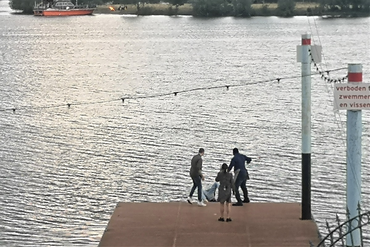 Unser Hotel liegt an einer zu einem See verbreiterten alten Maasschleife. Es ist das teuerste Hotel dieser Tour und hat noch dazu nur zwei Dreier-Zimmer für uns parat. Immerhin gibt es eine gut besuchte Gaststätte fürs Abendbier und ein Restaurant mit anständigem Essen. Später am Abend erleben wir die Taufe eines neuen Kollegen, den man tatsächlich kopfüber vom Hotelsteg aus ins Wasser wirft.