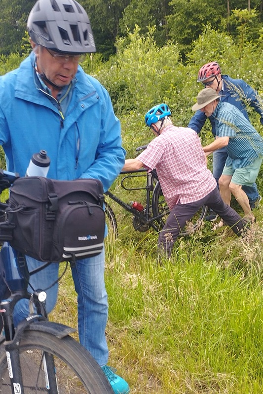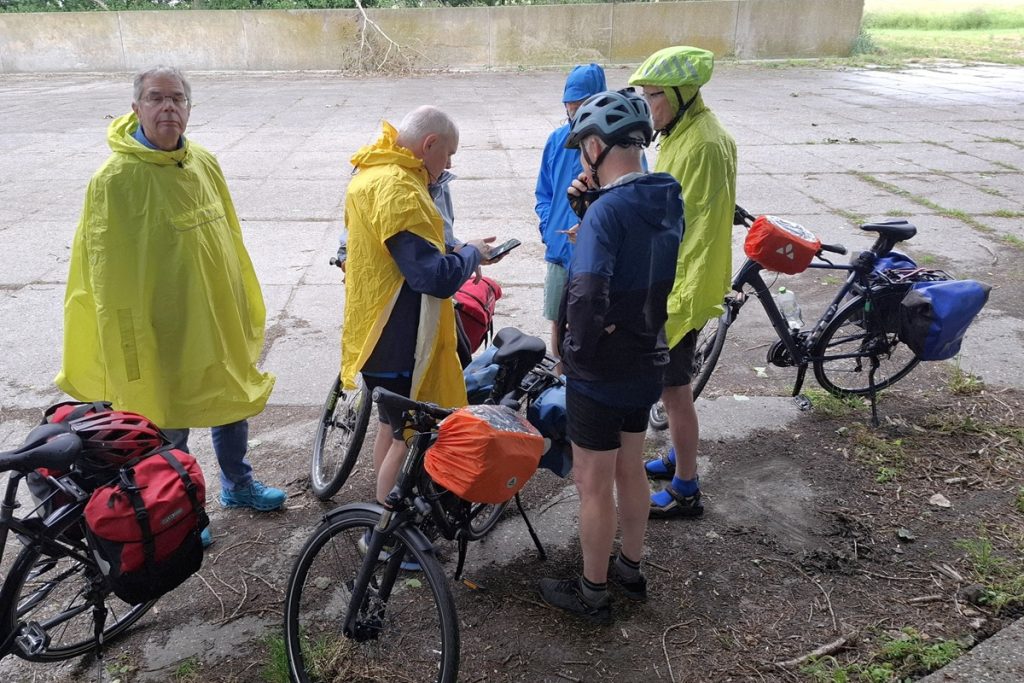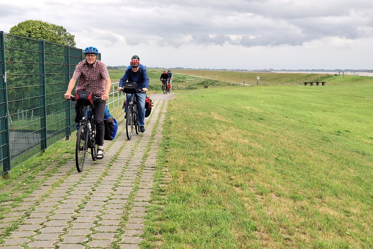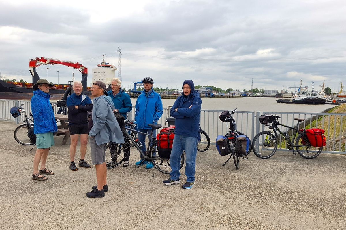Mit der Westfalenbahn geht es nach Papenburg. Bis auf wenige Minuten kommen wir pünktlich an. wir starten um 11 Uhr. Solange wir in nördliche Richtung fahren, haben wir Rückenwind und kommen schnell voran. Nach etwa 12 Kilometern bei Ihrhove ist unser Radweg entlang der Bahntrasse Papenburg-Emden gesperrt. Unsere Umfahrungsversuche enden im Nichts. Der Weg hört einfach auf. Dabei ist der planmäßige Weg höchstens 100 Meter entfernt. Zunächst durch hohes Gras, dann durch einen abgeholzten Waldstreifen mit Brombeergestrüpp und schließlich über einen gerade noch passierbaren Graben erreichen wir mit vielen Mühen und gegenseitigen Hilfen wieder Asphalt. Dort widmet sich jeder der Reifenkontrolle seines Rades. Es sind viele Dornen zu entfernen. Wir sind alle erfolgreich, bis auf Felix, dessen Vorderrad anschließend Luft verliert. Die weitere Fahrt bis Emden muss mehrfach durch Luftpumpen unterbrochen werden.