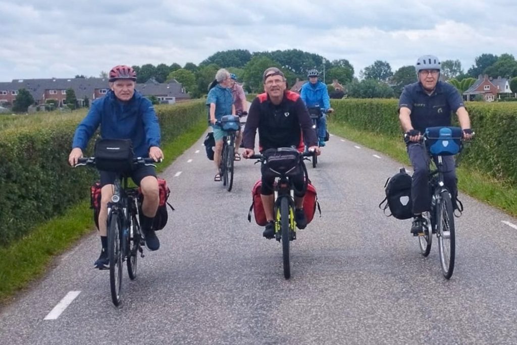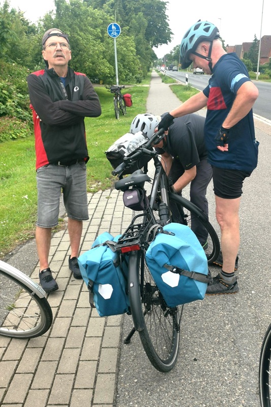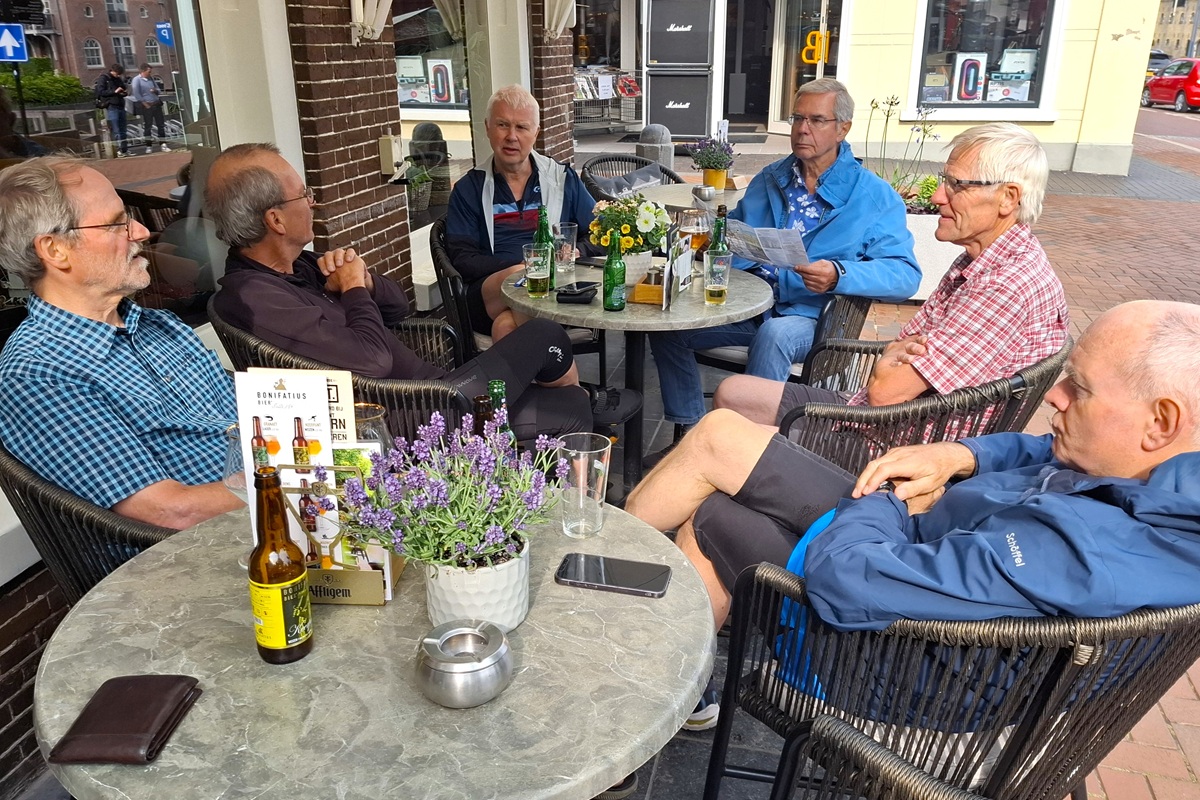 Auf der Fahrt heraus aus dem Städtchen verlieren wir Karl und Jürgen. Nach einem Anruf stoßen sie wieder zu uns. Es stellt sich heraus, dass ihre Hilfsbereitschaft, einem älteren Paar den Weg zu weisen, ursächlich war. Im Nachbarort Appingedam findet Felix noch einen Fahrradladen, der passende Schläuche vorrätig hat.
