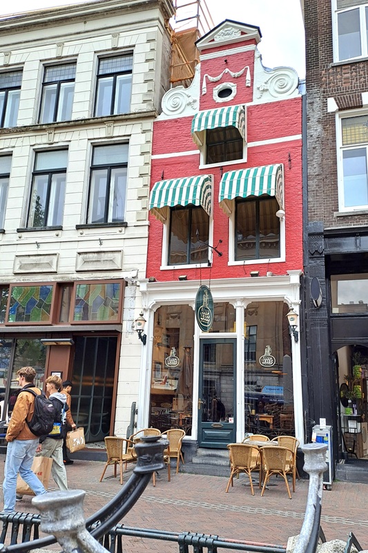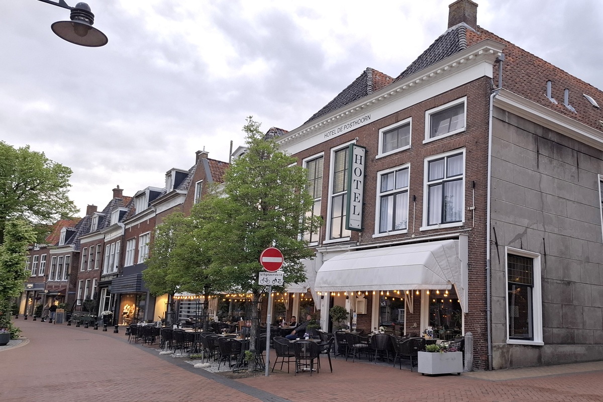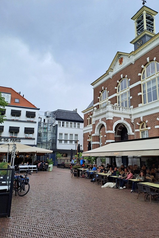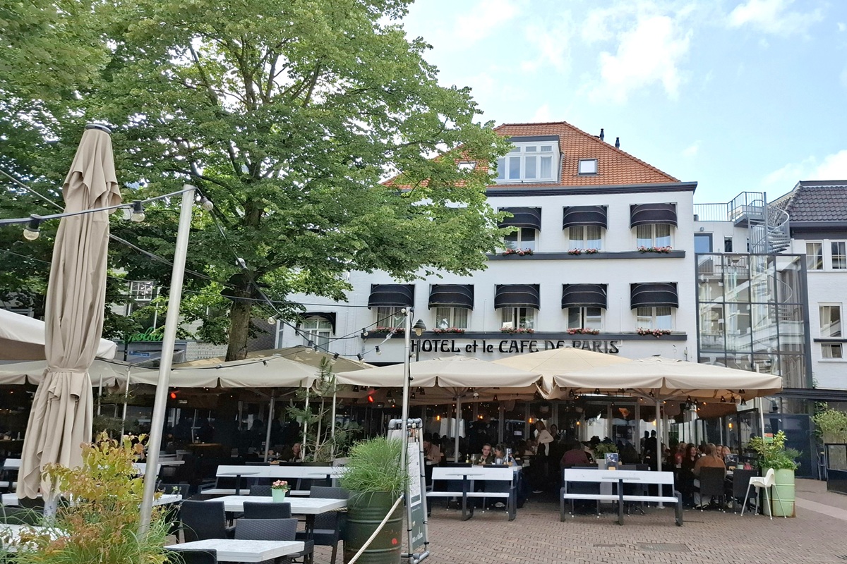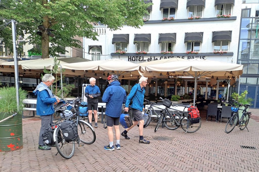 Die letzten zwanzig Kilometer bis Apeldoorn begleitet uns der Apeldoornsche Kanal. Unser Hotel Café de Paris liegt direkt neben dem alten Rathaus am Marktplatz. Zentraler geht es nicht. Das Einchecken dauert. Unsere Räder können wir im Gastraum eines mittlerweile geschlossenen Imbissbetriebes auf der anderen Marktseite abstellen. Und unsere Zimmer erreichen wir über eine der steilsten Treppen, die wir jemals in einem Hotel erlebt haben. Für Karl-Heinz geht es noch über eine weitere sehr steile Treppe in den zweiten Stock und da in das kleinste Einzelzimmer, dass er je gebucht hat, mit gefühlten sechs Quadratmetern und einer offenen Toilette hinter dem Bett. Was man nicht alles für eine Nacht erduldet. Wir essen heute Abend italienisch und beschließen den Tag mit einem kleinen Stadtbummel.