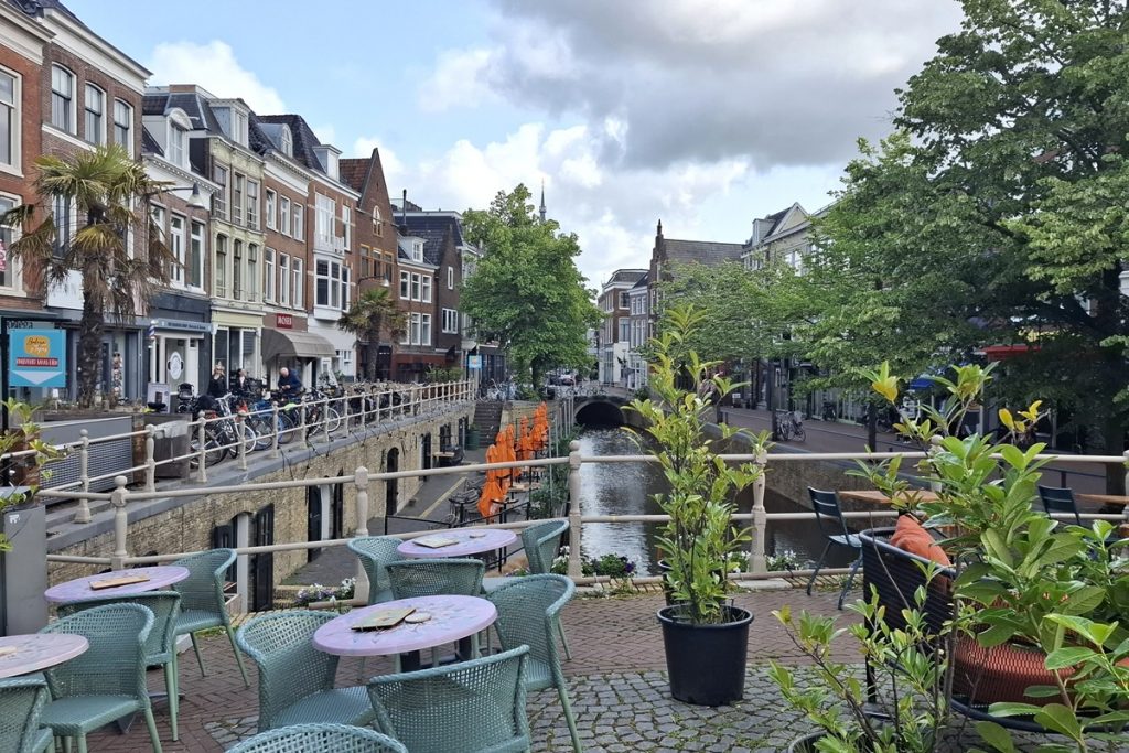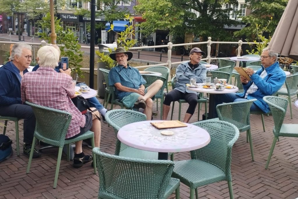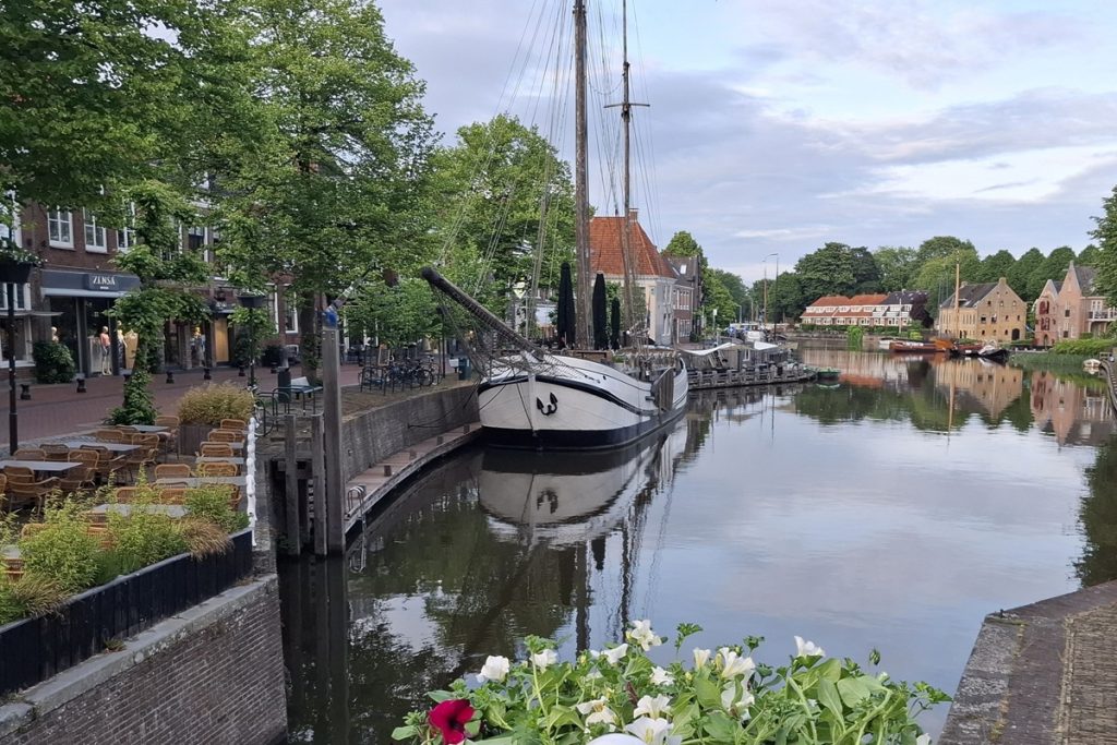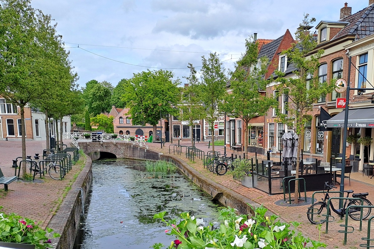 Heute bleibt es trocken. Der Wind ist aber noch stärker geworden. Und er ist böse gegen uns. Die ersten 25 Kilometer bis Leeuwarden ist wieder Kanalfahren angesagt. Es geht bis auf einen kleinen Abschnitt entlang der Dokkumer Ee. Mitten in Leeuwarden an der De Brol, einer sehr breiten platzartigen Brücke über die Dokkumer Ee finden wir ein nettes Café für die Mittagspause.