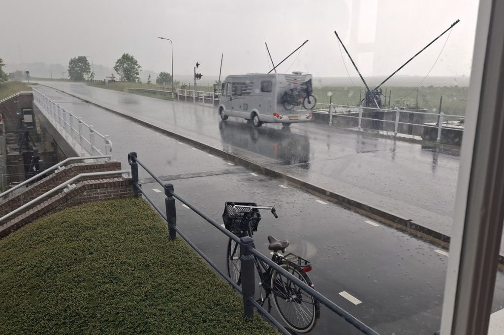 An der alten Seeschleuse des Dokkumer Dijps, die den Zugang zum Lauwersmeer regulierte, finden wir im Restaurant De Pater Zuflucht vorm drohenden Starkregen. Die Geschichte der Herberge geht bis in das Jahr 1726 zurück. Wir sitzen warm und trocken, werden sehr freundlich bedient und essen die beste Senfsuppe der Tour. Nach etwa einer Stunde lässt der Regen nach und wir können weiterfahren. Die letzten zwölf Kilometer entlang des Dokkumer Grutdijps bleibt es trocken. Auch am Abend regnet es nicht mehr.